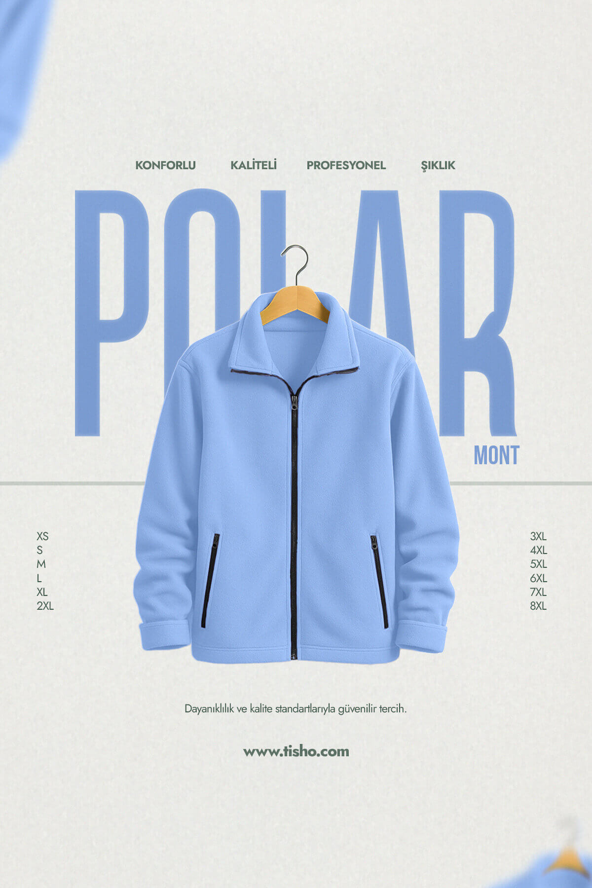 Soğuk havalarda hem sıcak hem de şık görünmek isteyenler için tasarlanan www.tisho.com Buz Mavisi Polar Mont, dayanıklılığı ve konforu bir araya getiriyor.