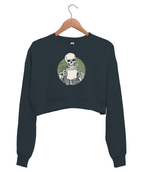 Kahve İçen İskelet - Skeleton Coffee Füme Kadın Crop Sweatshirt