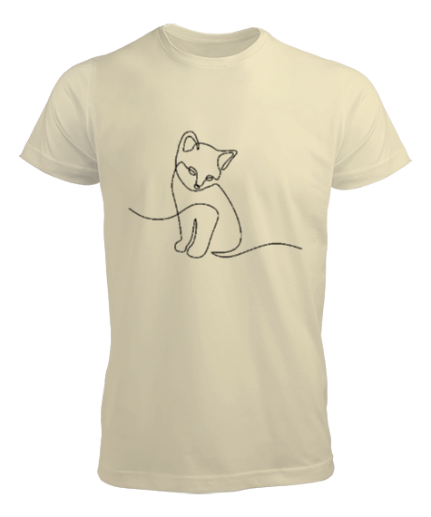 Kedili Kara Kalem İnce Çizgili Zarif Minimalist Özel Tasarım Sevimli Kedili Krem Erkek Tişört