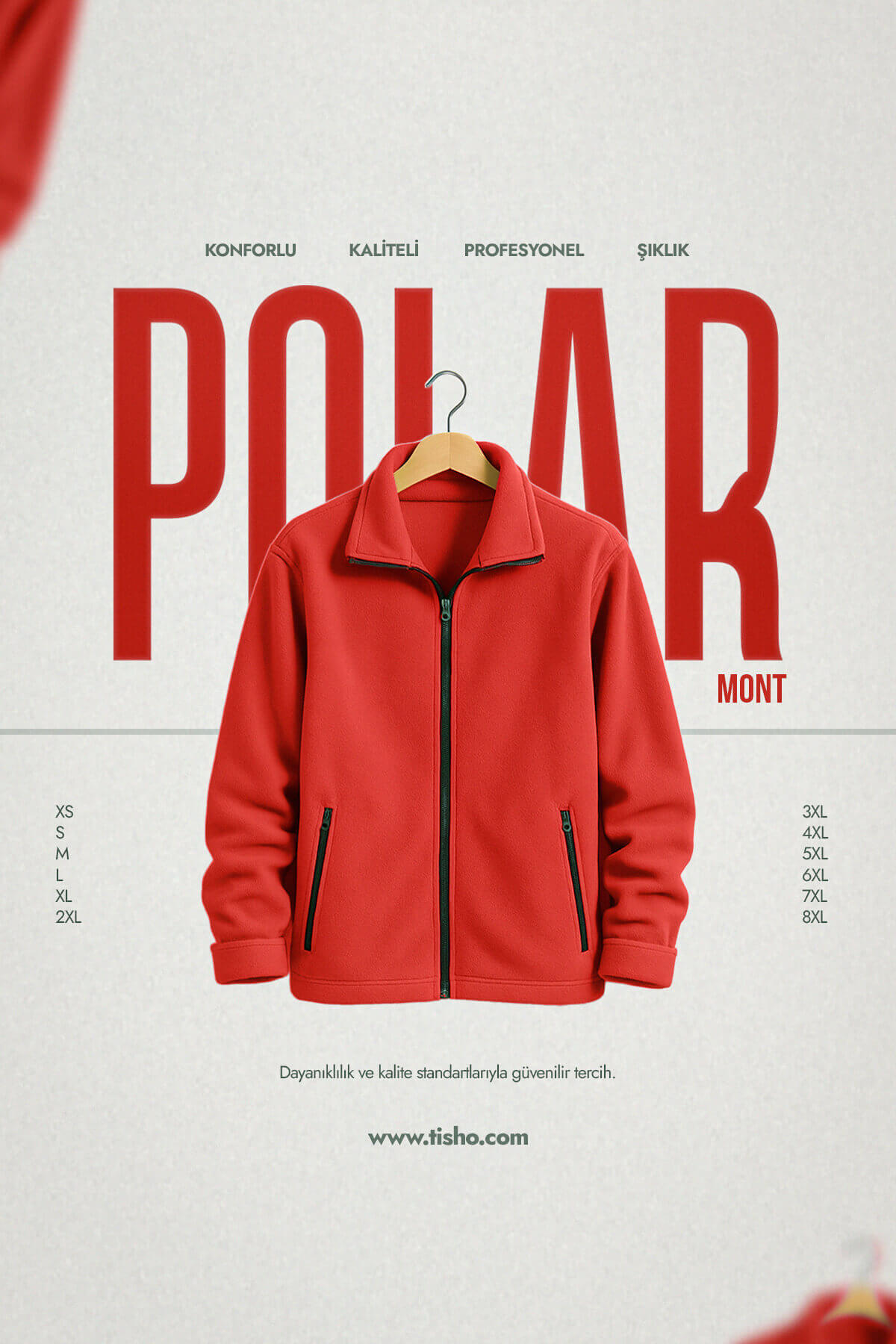 Şık tasarımı ve geniş renk seçenekleri (Kırmızı, Ekru, Siyah, Füme, Bordo, Çimen Yeşili, Haki Yeşili, Sax, Gri, Turuncu, Buz Mavisi, Bej Camel, Lacivert, İndigo, Sarı, Pembe, Lila, Turkuaz, Mor, Fıstık Yeşili, Kahverengi) ile hem iş ortamlarında hem günlük hayatta kolayca kombinlenebilir. Sağlam fermuarları, konforlu iç yapısı ve soğuk hava koşullarına karşı üstün korumasıyla www.tisho.com Polar Mont, iş kıyafetlerinde güvenilir, günlük kullanımda ise vazgeçilmez bir tercih.