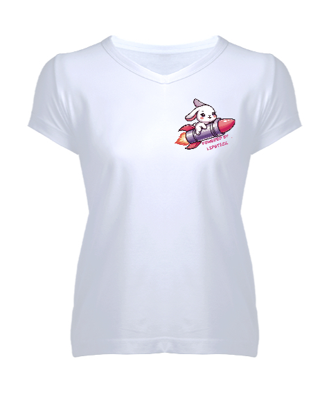 Ruj roketiyle sevimli tavşan, powered by lipstick Beyaz Kadın V Yaka Tişört