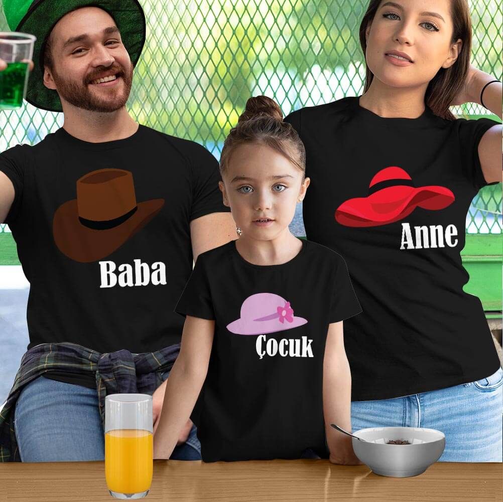 Şapka Temalı Anne Baba Kız Çocuk Tişört Kombini