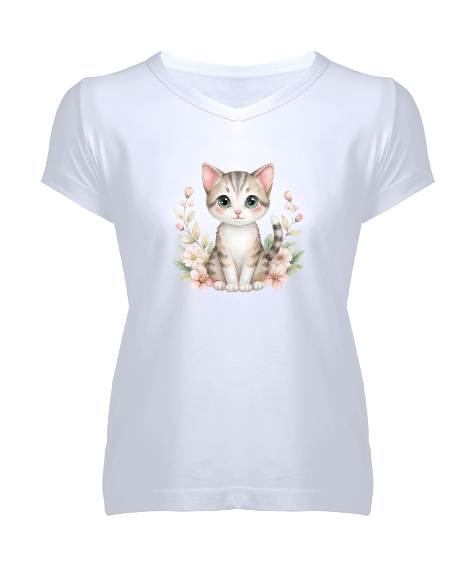 Sevimli Kedi - Cat Beyaz Kadın V Yaka Tişört