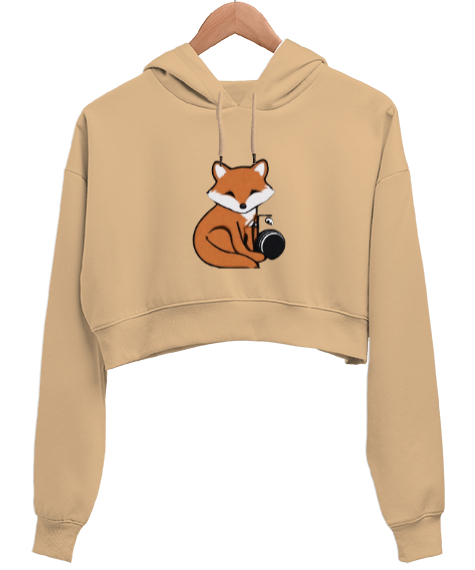 Tilki Camel Kadın Crop Hoodie Kapüşonlu Sweatshirt