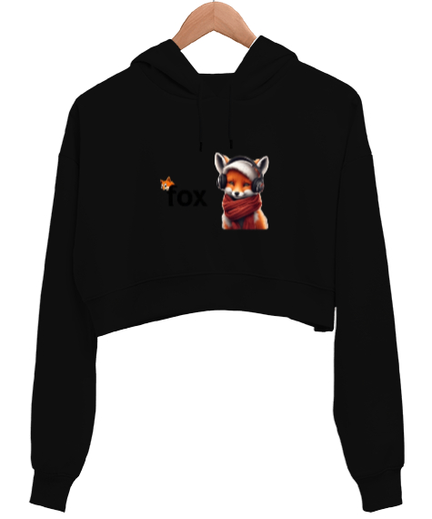 Tilki Siyah Kadın Crop Hoodie Kapüşonlu Sweatshirt